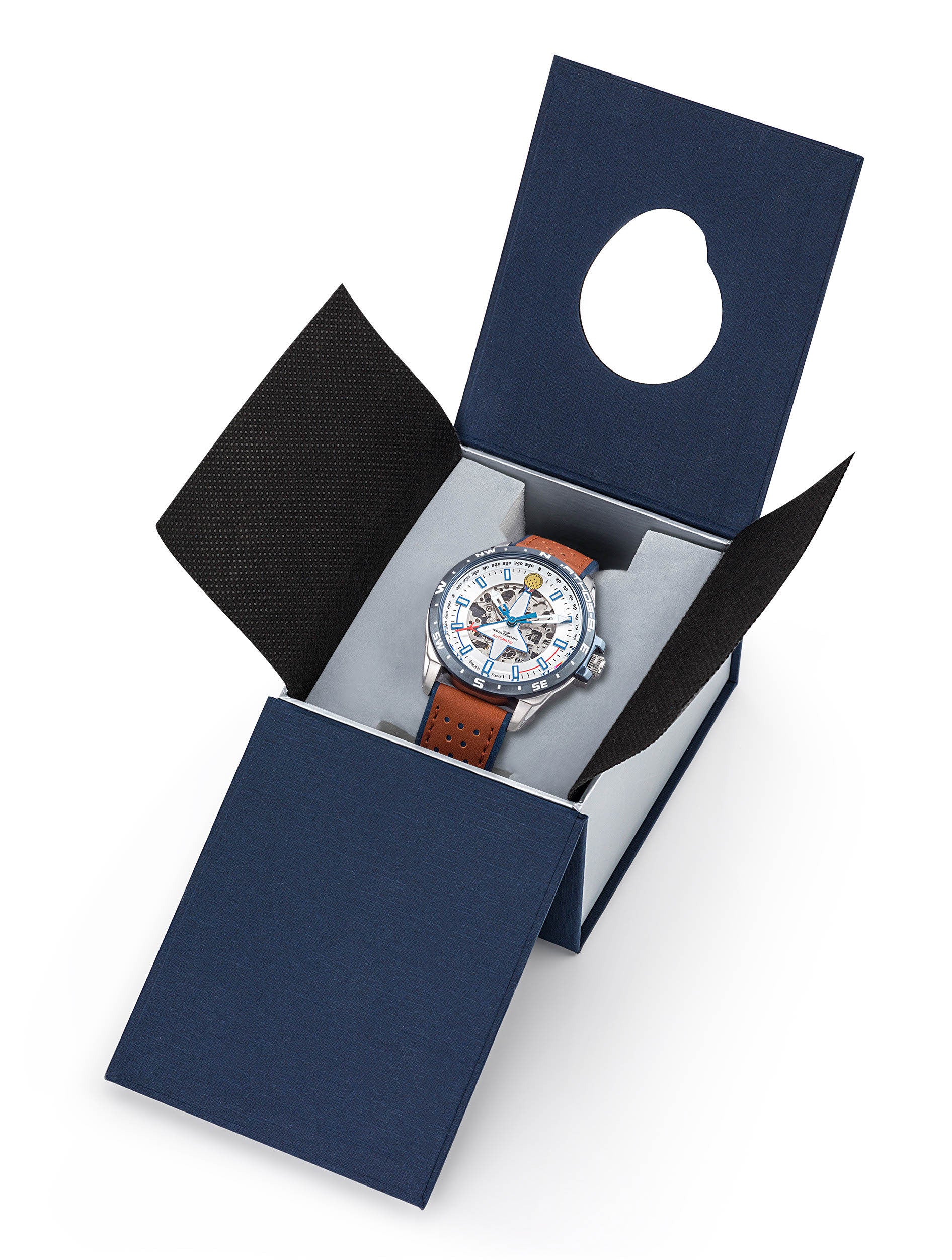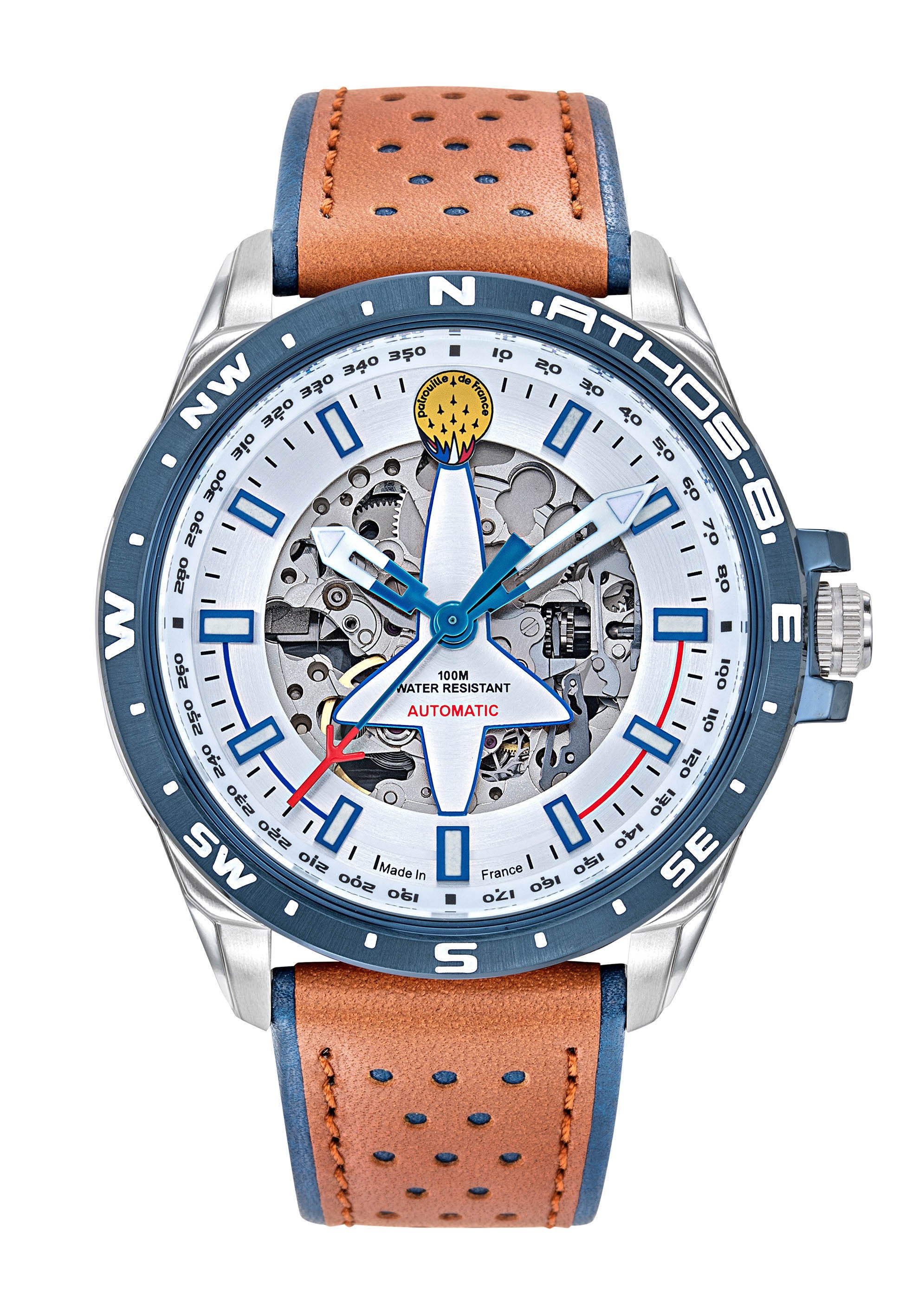 Montre Automatique, étanche 100 mètresCarrure et lunette en acier inoxydableFinition de la lunette en PVD bleuCouronne protégéeBracelet en cuirConception et fabrication : Ateliers LIP à BesançonMontre Aviateur ATHOS 8 cadran inversé A l’instar de tous les Athos, rigueur et précision sont les qualités indispensables d’Athos 8. C’est pourquoi notre Montre Automatique Argenté Cuir marron A8-100ED-668130 mesure le temps avec justesse et sureté grâce à notre savoir-faire horloger.Dans la Patrouille de France, le pilote Athos 8 évolue en position d’extérieur droit, loin derrière le leader. Ce poste nécessite une faculté d’anticipation et une précision de pilotage extrêmes afin de permettre de maintenir sa position dans la formation.Grâce à son sens de l’observation et à son dévouement total, Athos 8 est capable de s’approprier de grandes vitesses pour effectuer les rejointes des solos ou de réaliser des figures spectaculaires lors de la synchronisation dans la deuxième partie de la série de vol.La découpe inversée d’un Alphat Jet sur le cadran de notre Montre Automatique Argenté Cuir marron A8-100ED-668130 fait écho aux avions profilés de la PAF. Cette montre de haute voltige laisse entrevoir son mouvement automatique 21 rubis. Un mécanisme automatique pour avoir toujours un coup d’avance.