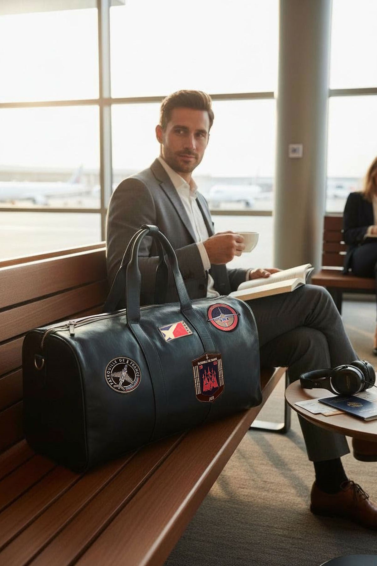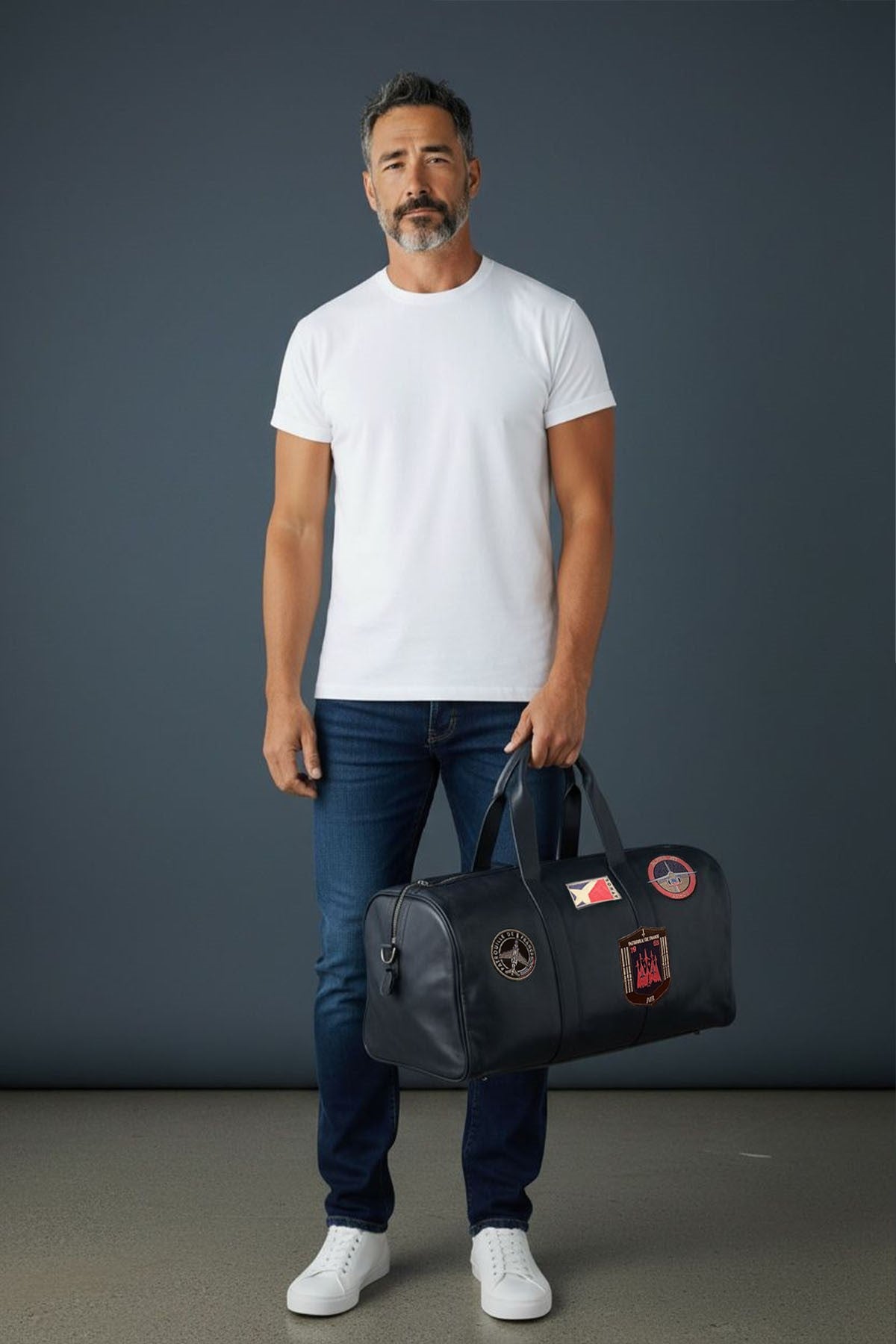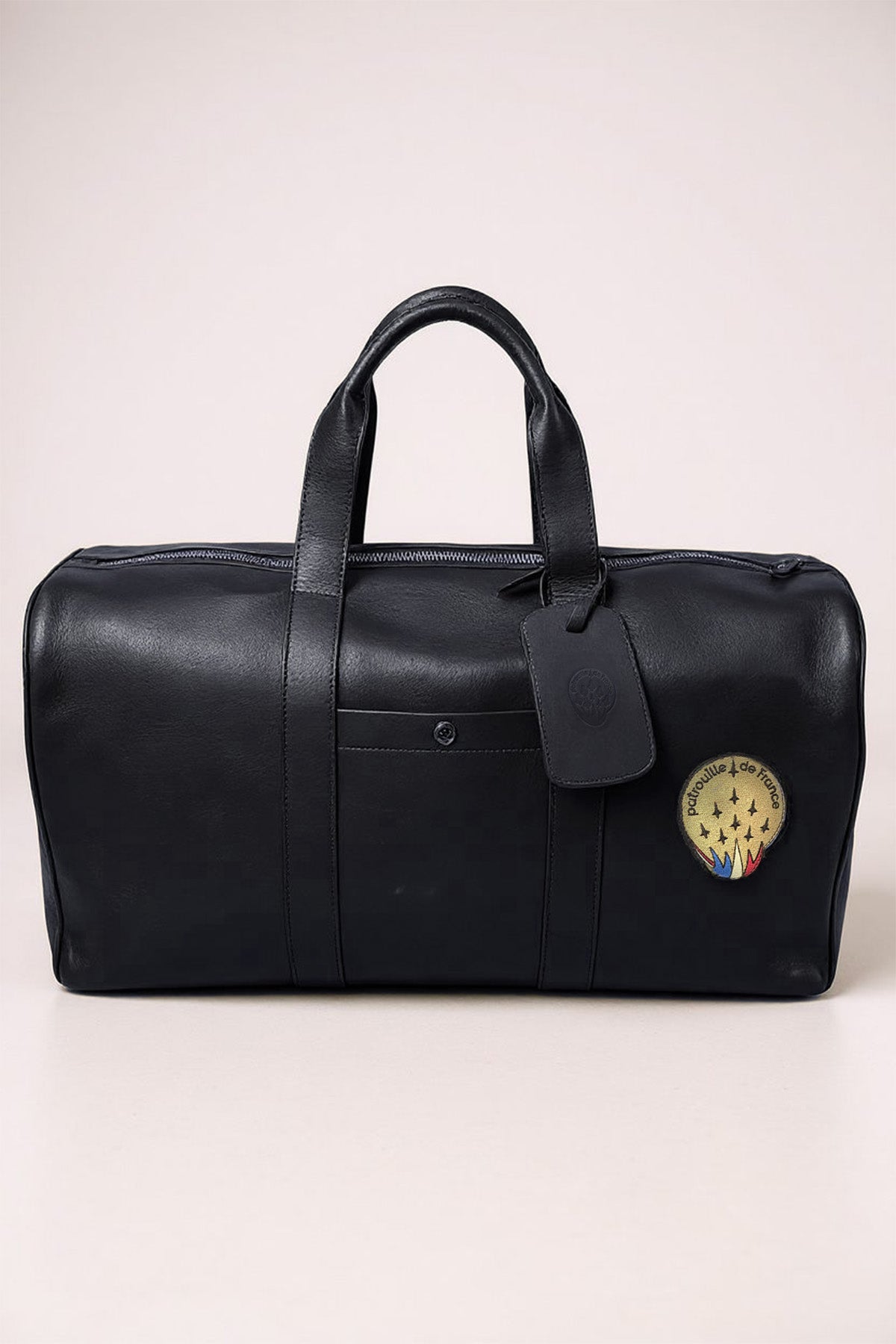 Sac weekend CORSAIR SPIDER personnalisé Patrouille de France, conçu en cuir de vachette. 55 x 35 x 25 ( Longueur x Hauteur x Largeur). Bandoulière amovible ajustable. Poche latérale avec fermeture bouton pression personnalisé. 2 Poignées en cuir vachette avec détails en cuirs le long du zip et sur la largeur. 4 Patchs Patrouille de France sur un côté, la célèbre patate Patrouille de France sur l'autre.