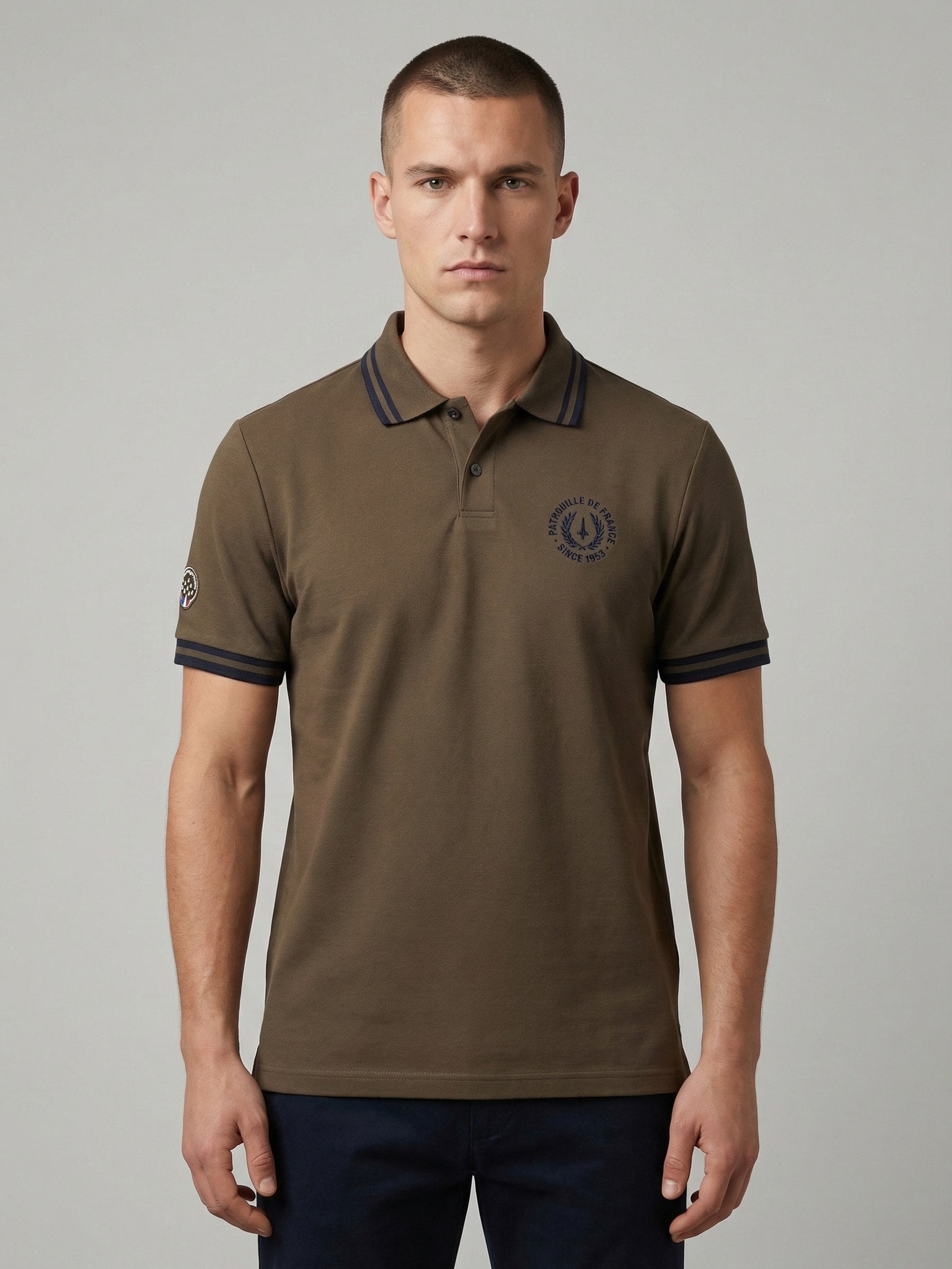 Découvrez le polo RIFT ARC (53% coton piqué, 47% polyester), col revers, boutons d'attache, logo Patrouille de France côté cœur, fentes latérales au niveau de la taille, badges sur l'épaule droite. Collection Patrouille de France by Redskins