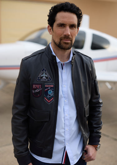 Veste OPIUM NAPOLI en cuir d'agneau, col montant avec fermeture boutons pressions, zip central, 2 poches latérales à rabats avec boutons pressions, 2 poches raglans sur les poches à rabats, logo PATROUILLE DE FRANCE au niveau de l'épaule droite, 3 logos PATROUILLE DE FRANCE brodés au niveau du torse côté droit, poche zipée arrondie au niveau de l'épaule gauche, petit drapeau français brodé sous la poche de l'épaule gauche. Collection Patrouille De France by Redskins.