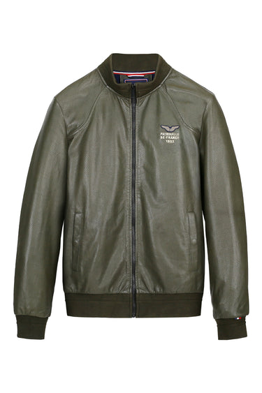 Veste TURBO JET en cuir d'agneau perforé, col montant, 2 poches latérales avec bouton pression, petit drapeau français brodé sur la manche gauche. Collection Patrouille De France by Redskins.