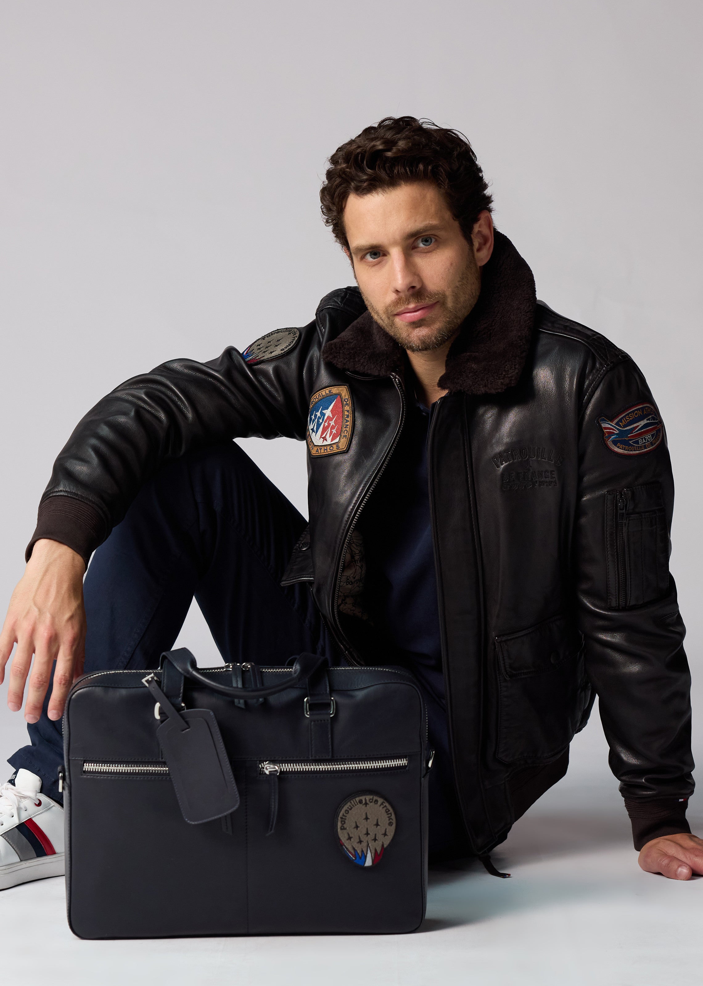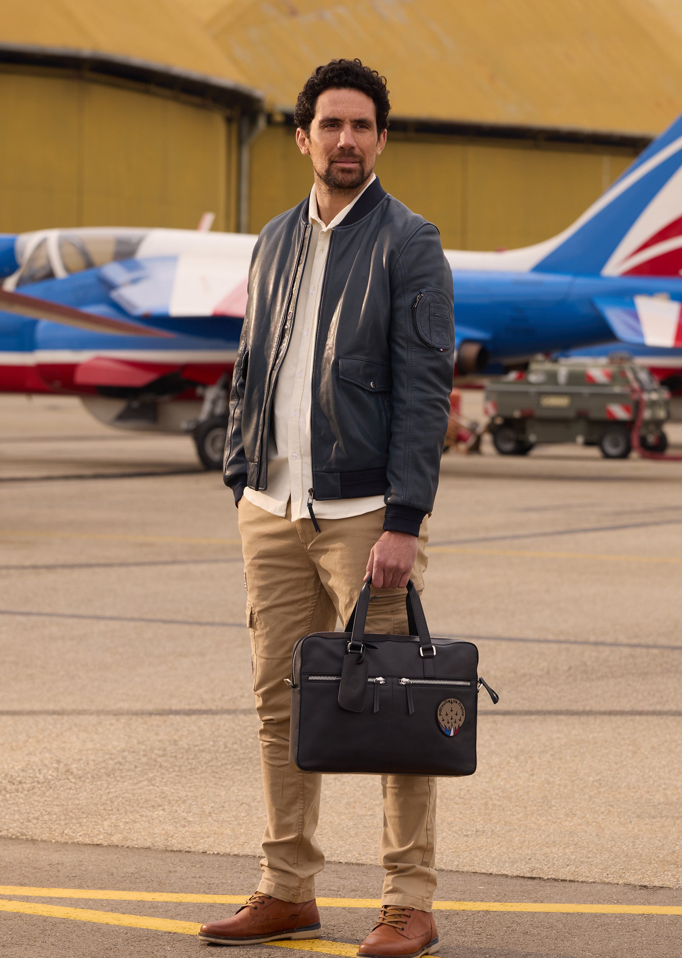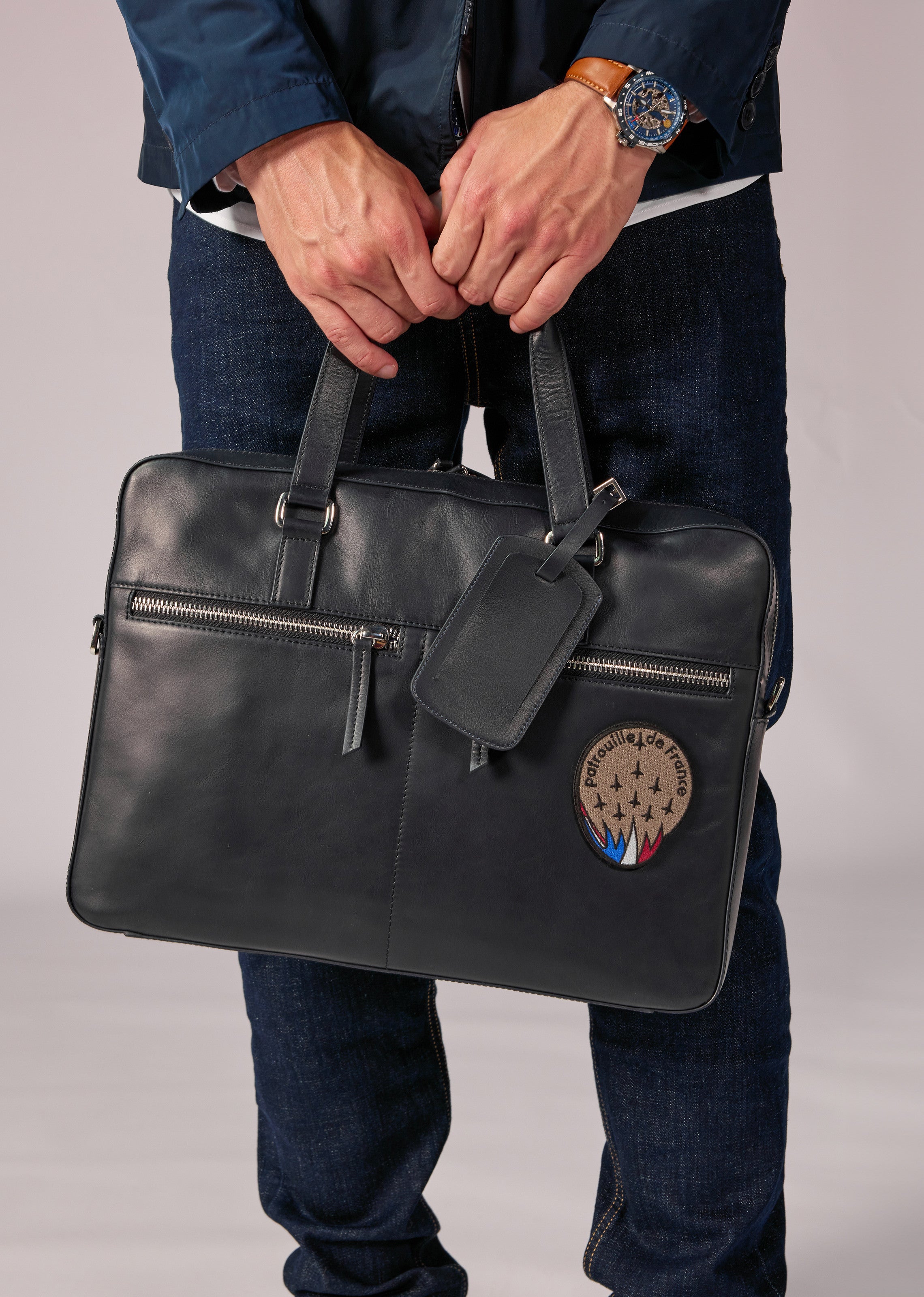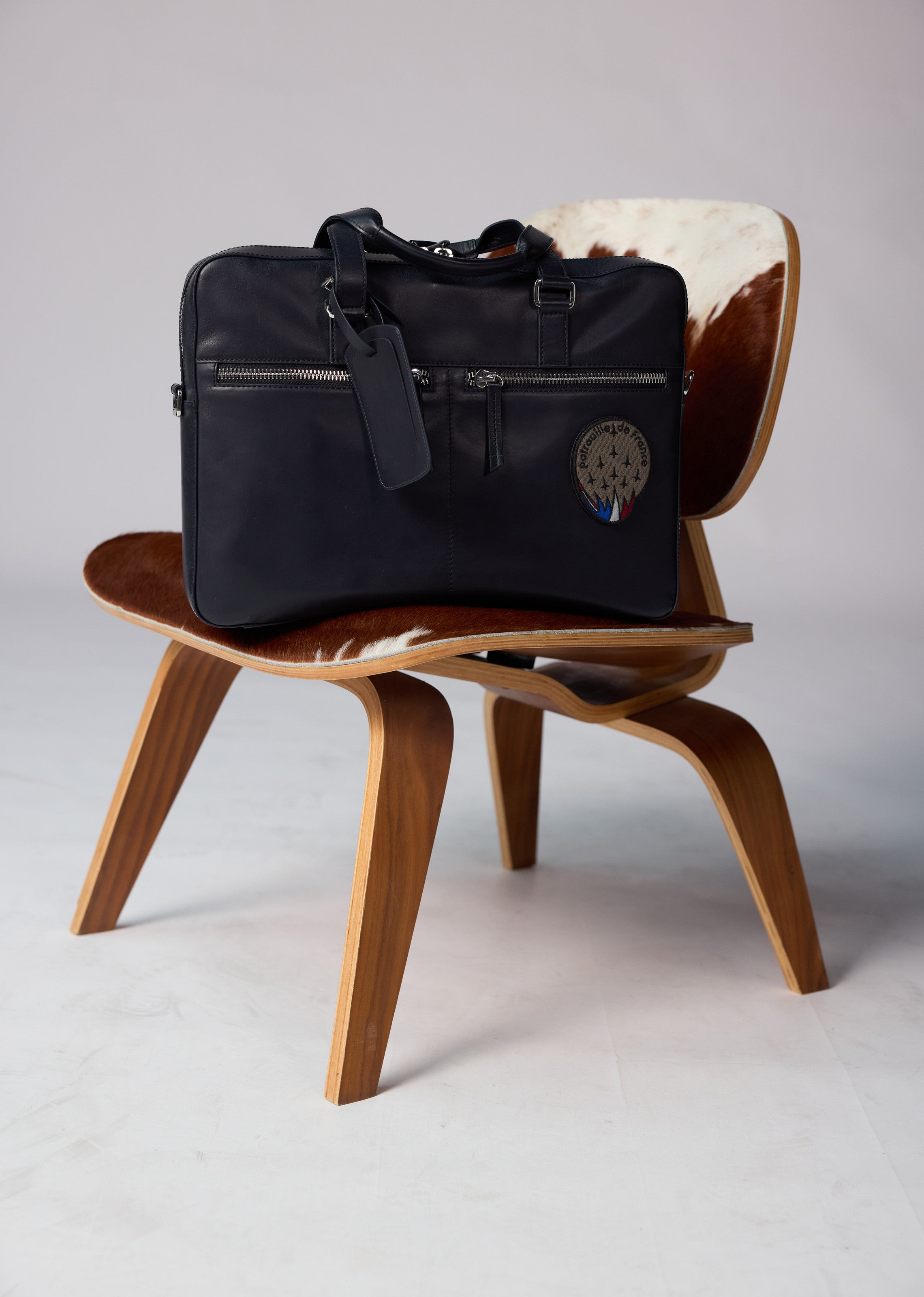 Sac weekend MESSENGER SPIDER personnalisé Patrouille de France, conçu en cuir de vachette. 55 x 35 x 25 ( Longueur x Hauteur x Largeur). Bandoulière amovible ajustable. 2 Poches latérales avec fermetures zippées et une grande poche à fermeture pression personnalisée. Doublure du sac personnalisée. La célèbre patate Patrouille de France sur le côté gauche.