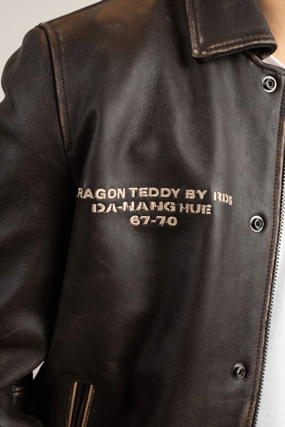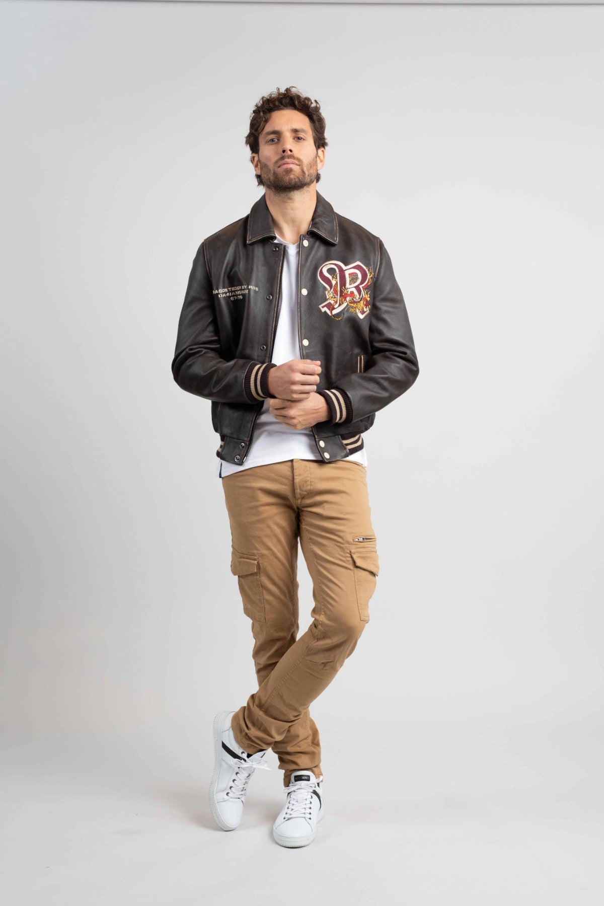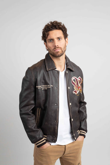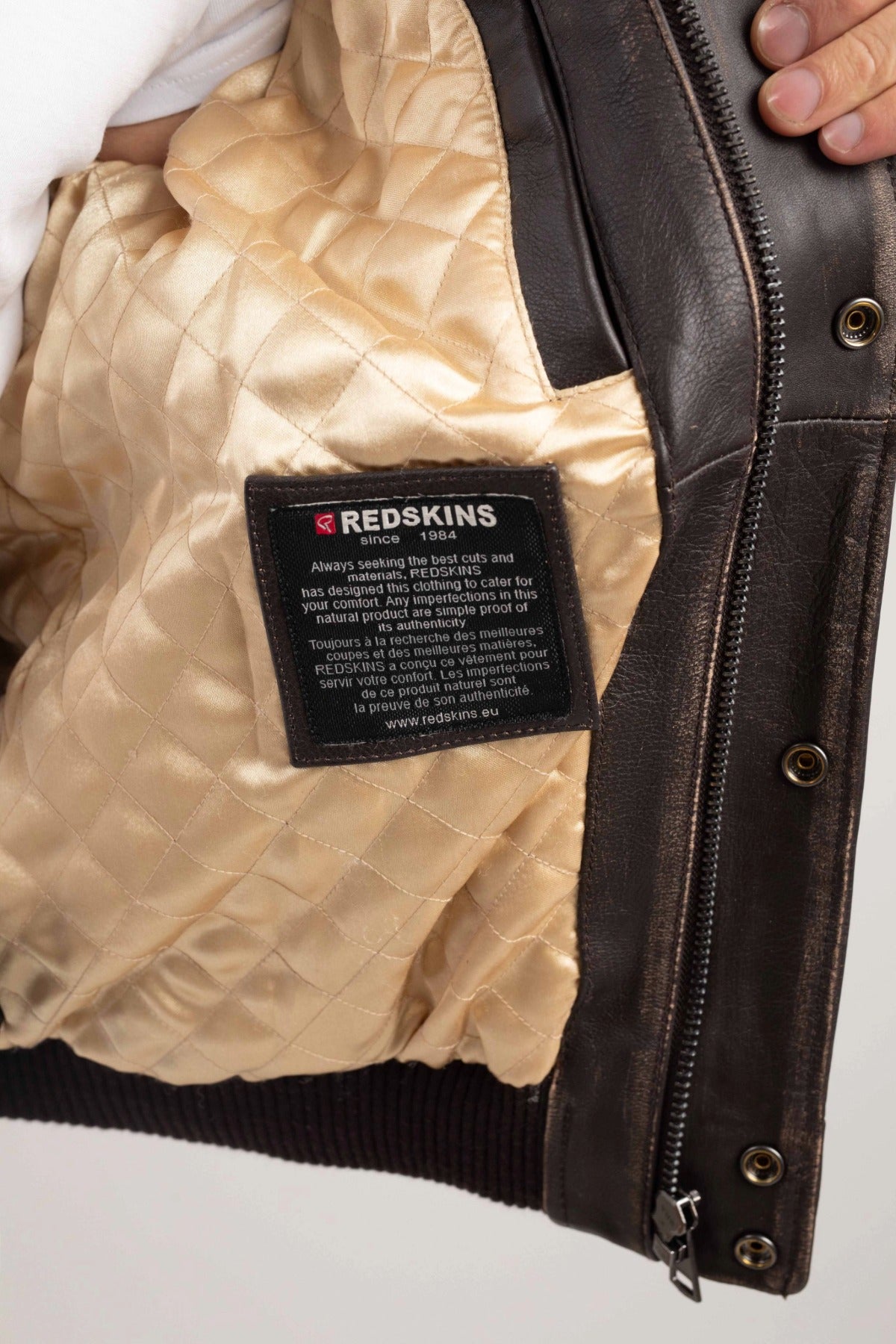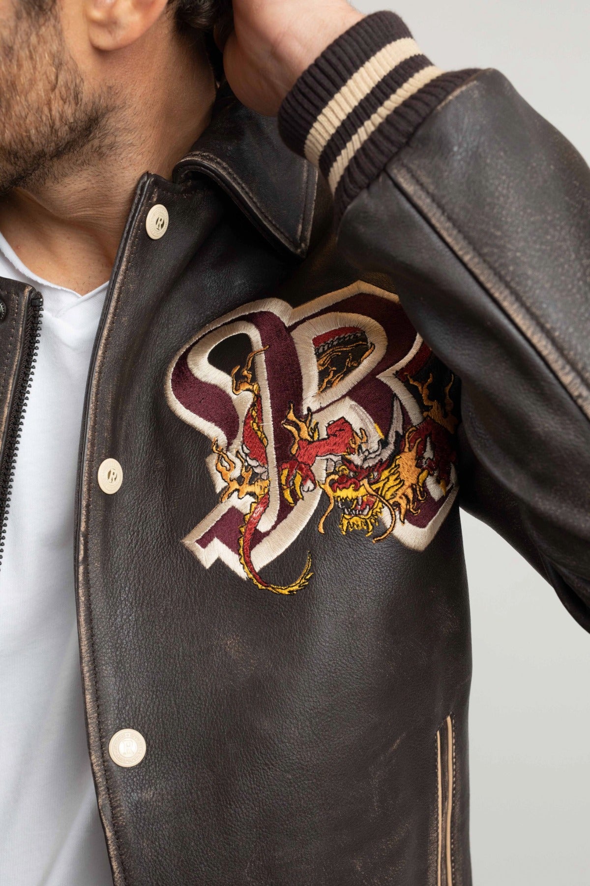 Découvrez le CUIR DRAGON COHIBA, broderie d'un dragon et de "Redskins" dans le dos, broderie "R" sur la face avant gauche et broderie d'un petit texte sur la face avant droite, 2 poches passepoilées latérales, fermeture à boutons de pressions, parfait pour un style moderne et attrayant, composition : cuir de vache.